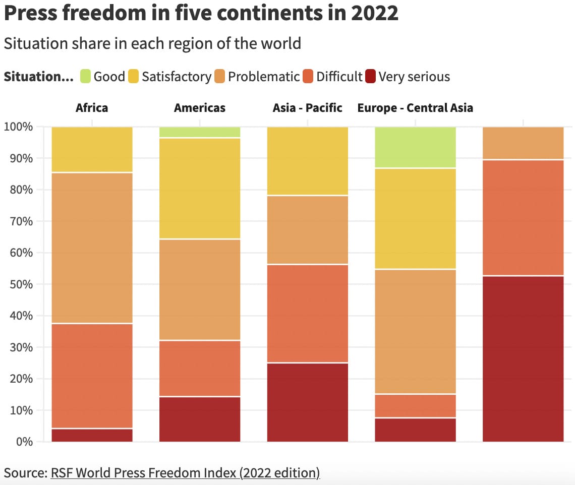 It’s important to remember that repression against journalists, regardless of death totals, isn’t a West vs the rest issue. Case in point: Germany (16th), Canada (19th), the UK (24th), France (26th), Spain (32nd) and the U.S. (42nd) all rank in the second tier of press freedom in the World Press Freedom Index 2022.