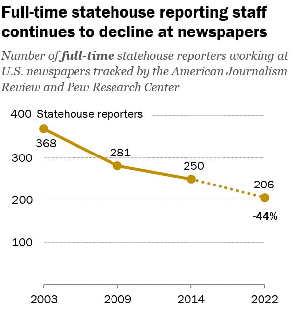 The gutting of reporters on the ground holding local and national politicians accountable by the institutions at the top isn’t new. These private and public firms’ number one aim is to make profit and will do whatever it takes to cut costs regardless of the human capital in their way. According to Pew Research Center, the number of full-time statehouse reporters at U.S. newspapers has declined 44% since 2003. That means there’s essentially on average only four reporters assigned to each of the 50 statehouses.