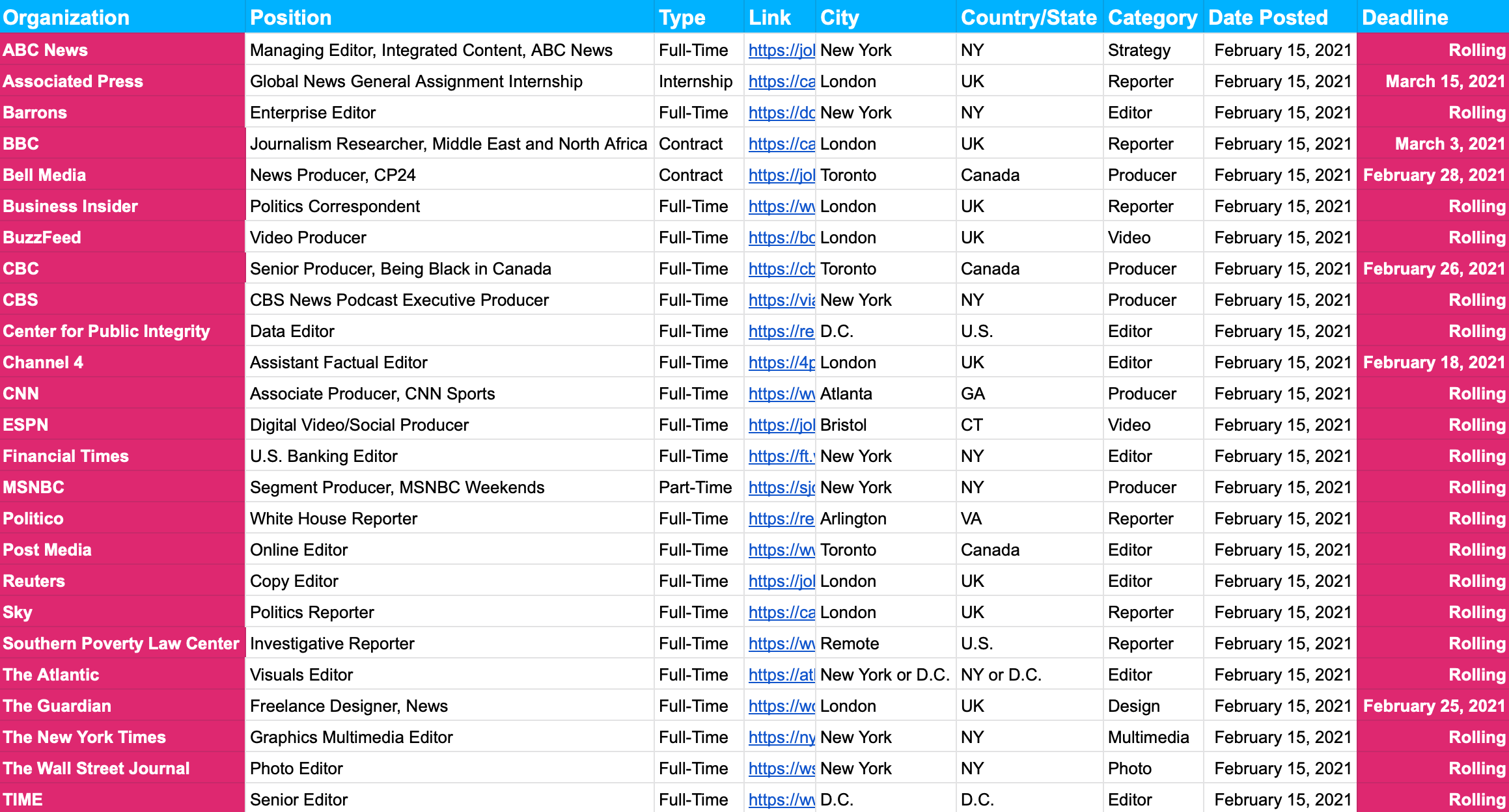 New jobs this weekend include at the likes of ABC News, Barrons, the Center for Public Integrity, Channel 4 (UK), ESPN, MSNBC, Sky News, The Guardian, The New York Times, The Wall Street Journal and TIME.
