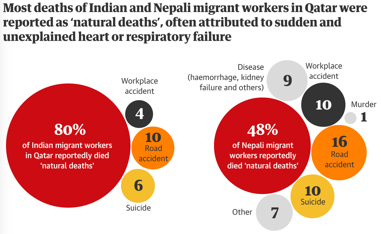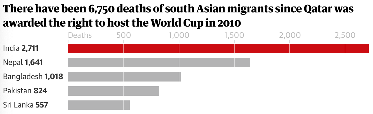We finish today in Qatar where The Guardian revealed that more than 6,500 migrant workers died in the past ten years, since it was announced that the country would host the soccer World Cup in 2022. The majority of the victims came from India, Pakistan, Nepal, Bangladesh and Sri Lanka, who worked at breakneck speed to make the tournament’s spectacular stadiums ready in time.