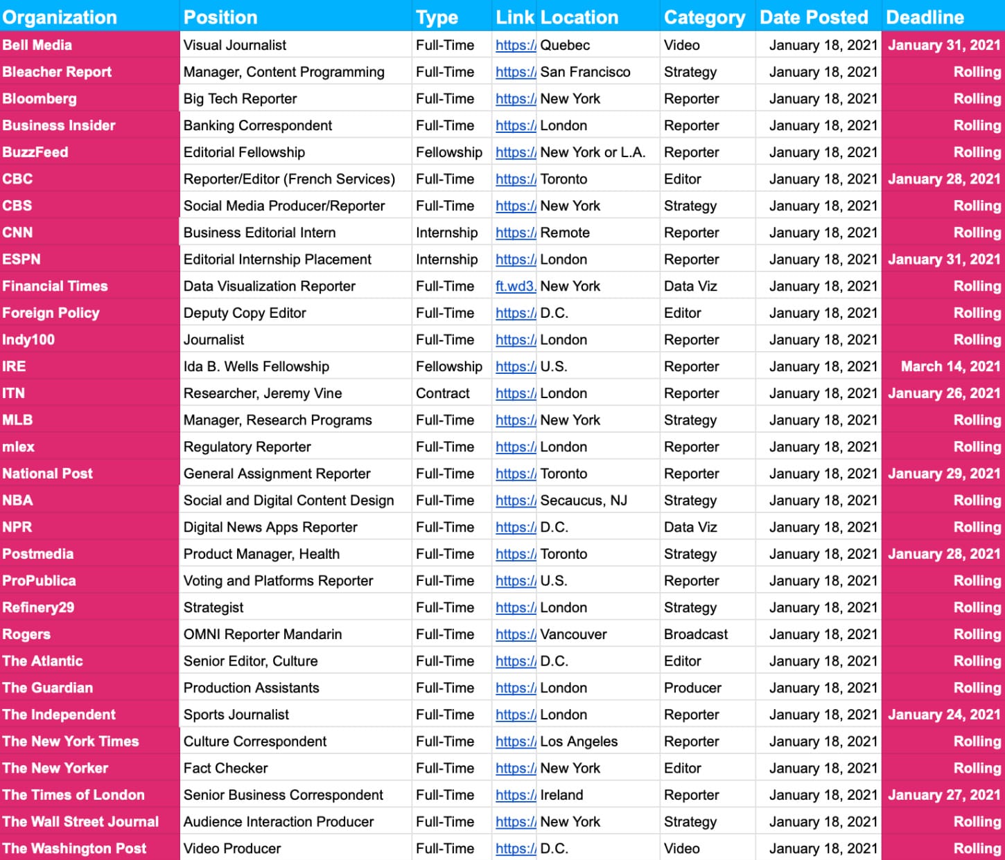Another 311 new jobs added over the weekend, including at the likes of Bloomberg, CNN, ESPN, the Financial Times, ITV, MLB, National Post, NBA, NPR, The Atlantic, The Guardian, The Independent, the New York Times, The Times of London, the Wall Street Journal and the Washington Post…