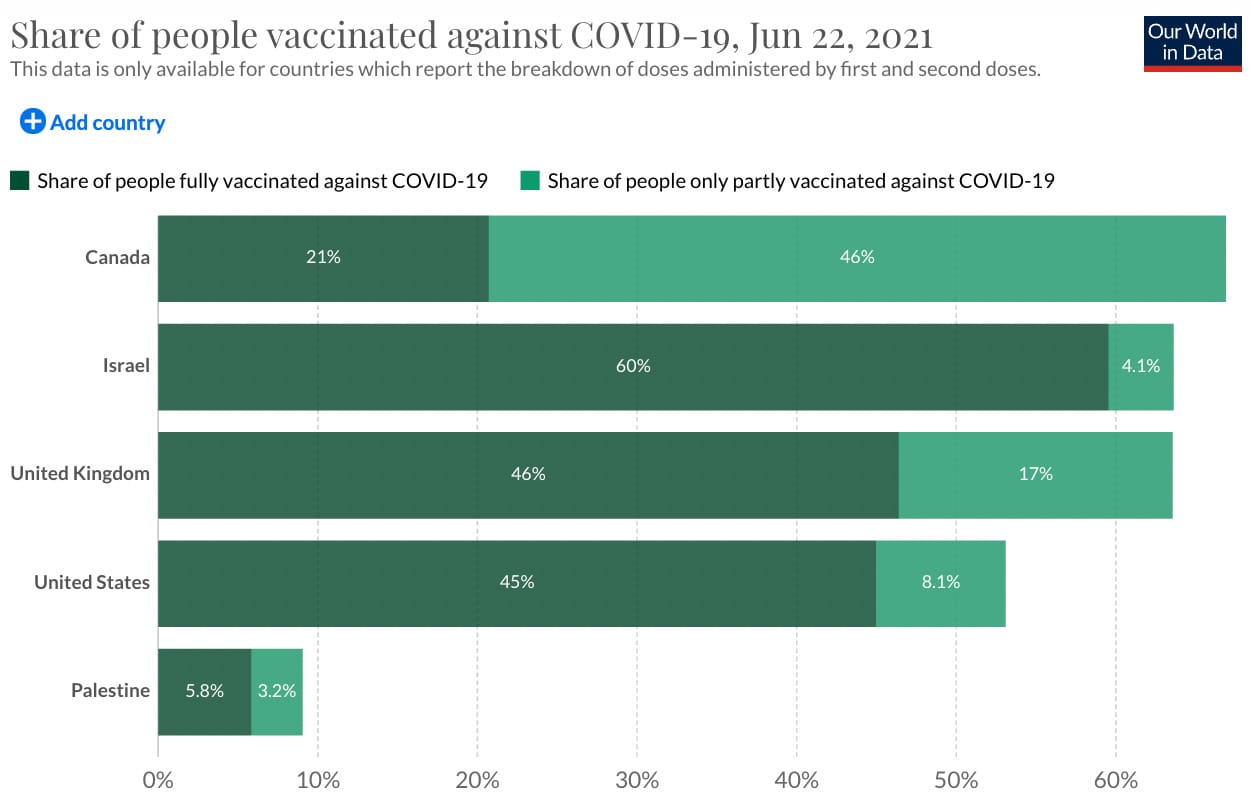 The speed at which Israel has vaccinated the majority of its nine million people has been impressive, but has been heavily criticised for not vaccinating Palestinians in the West Bank and Gaza. Israel is obliged to do so under the Geneva Conventions, but the government says it’s relieved of these obligations because the Oslo Accords designate responsibility for medical care provision to the Palestinian Authority.