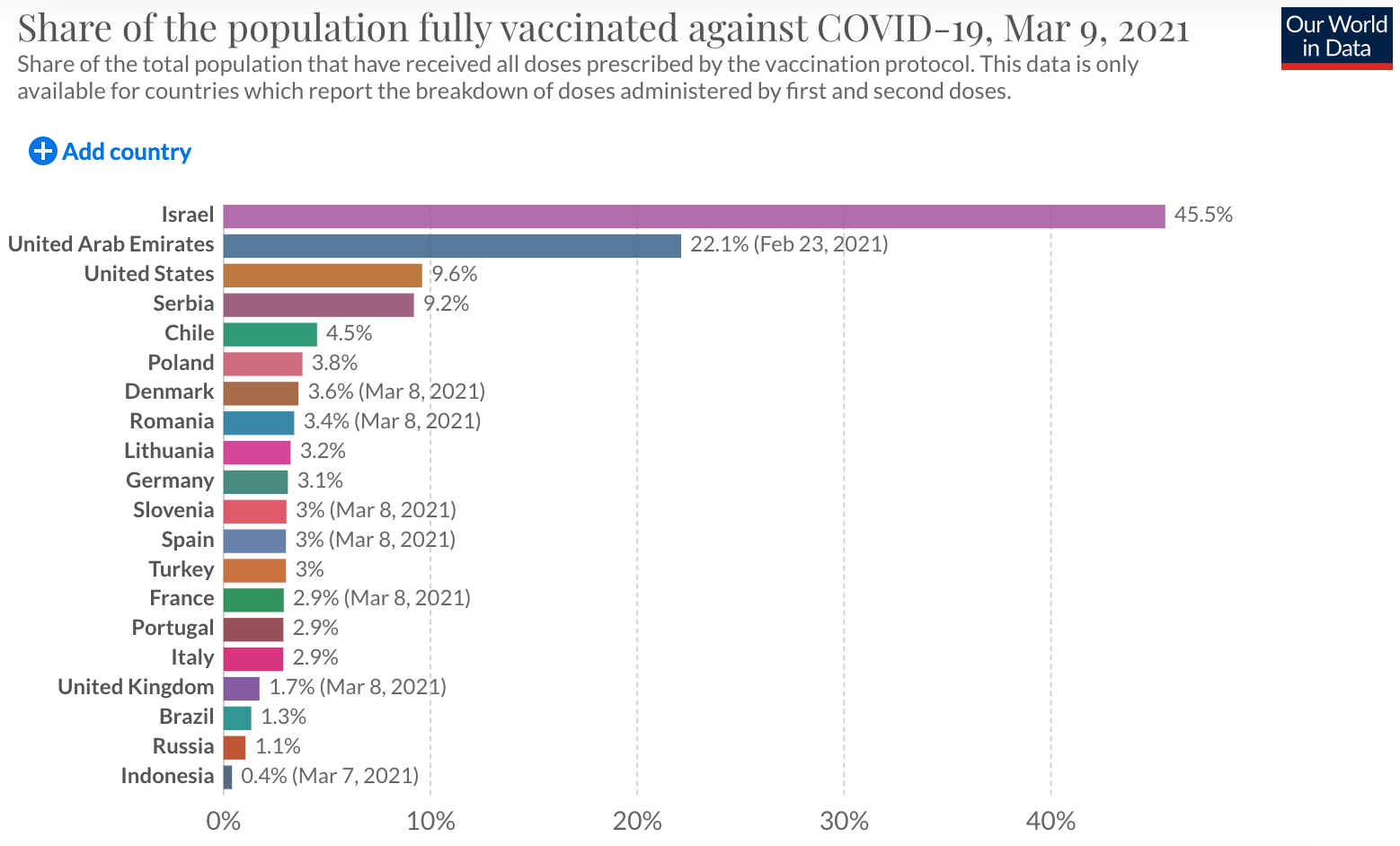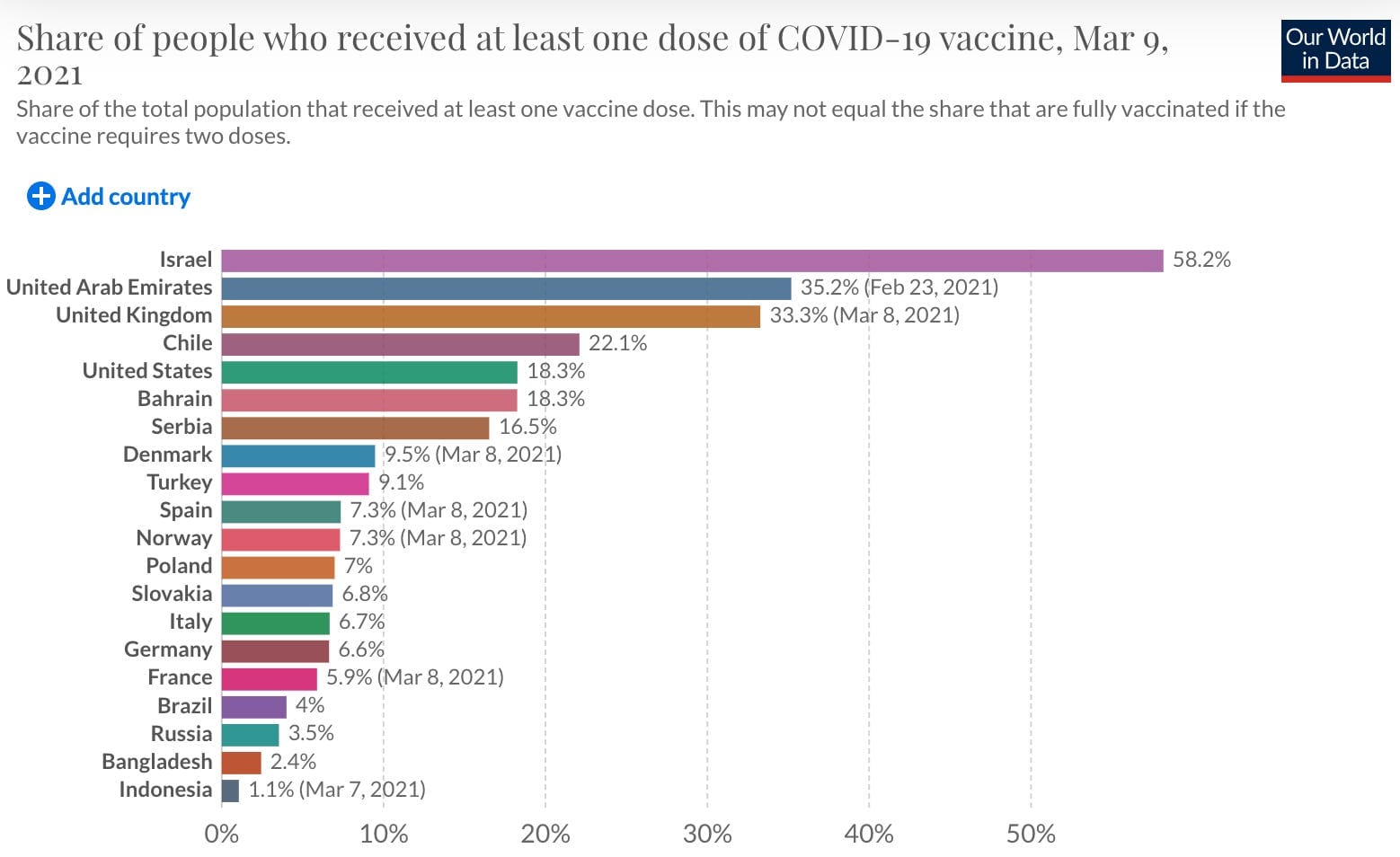Israeli Prime Minister Benjamin Netanyahu began inoculating his own people two months ago, and has faced strong criticism from the international community for neglecting his responsibilities to the Palestinian people as an occupying power. But he has maintained that the 1990 Oslo Accords mean his country has no such obligation. Meanwhile, Israel leads the world with its rollout, with 58 percent of Israelis receiving a first dose, and 46 percent already fully vaccinated.