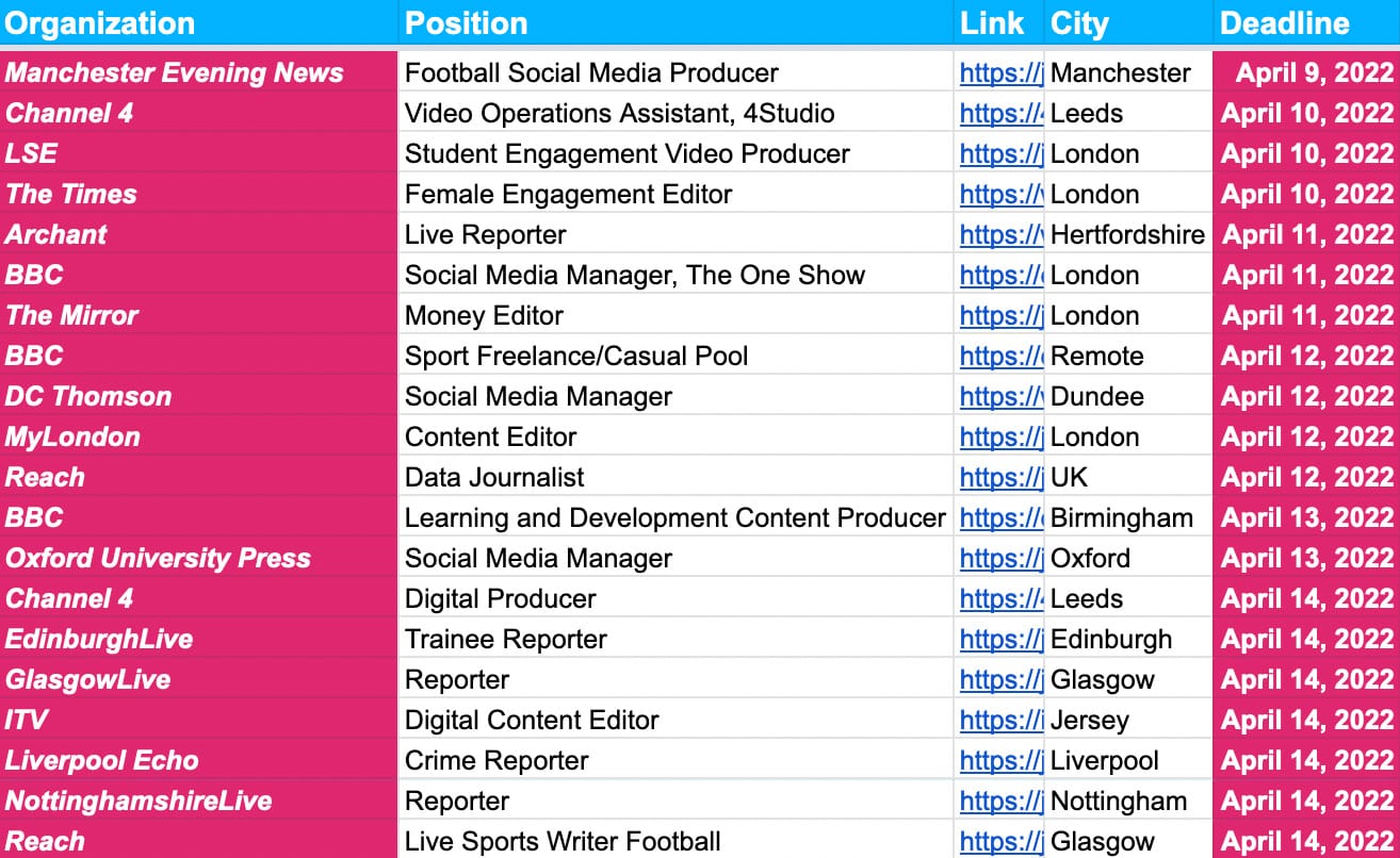 Job-board two-year anniversary plus hundreds of deadlines across the UK, U.S. Canada and Europe at the BBC, The Times, Associated Press, Euractiv, The New Humanitarian, CBC and the Washington Post