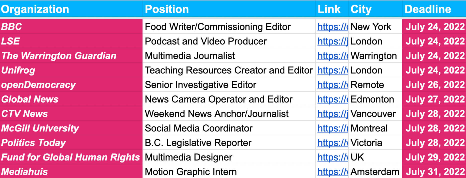 BBC, Chicago Reader, LSE, Fund for Global Human Rights, Politics Today, Unifrog and hundreds more deadlines