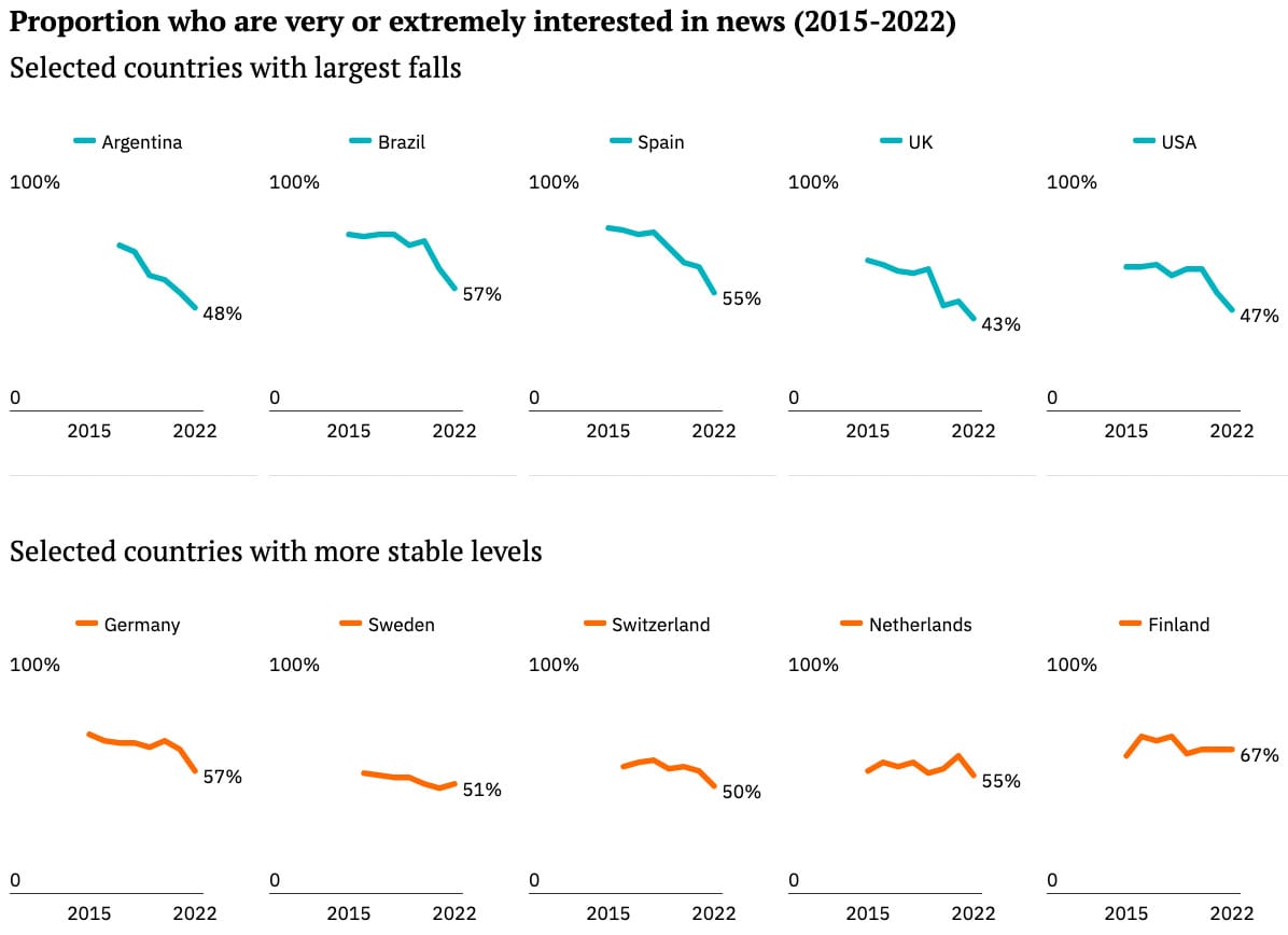 Also happening this week was the release of the 2022 Digital News Report from the Reuters Institute for the Study of Journalism and University of Oxford. Indeed there seems to be a new report of some kind released weekly, but the DNR is among the most definitive and comprehensive, and certainly one I turn to for the latest trends. I’ve highlighted some of those new insights below all the jobs stuff. 👍
