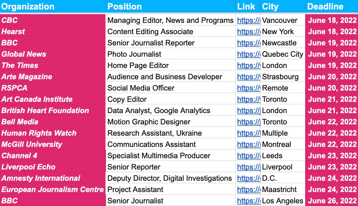 Plus Digital News Report 2022 trends and deadlines at the BBC, The Times, Hearst, Human Rights Watch, European Journalism Center, Liverpool Echo, Amnesty International and Bell Media