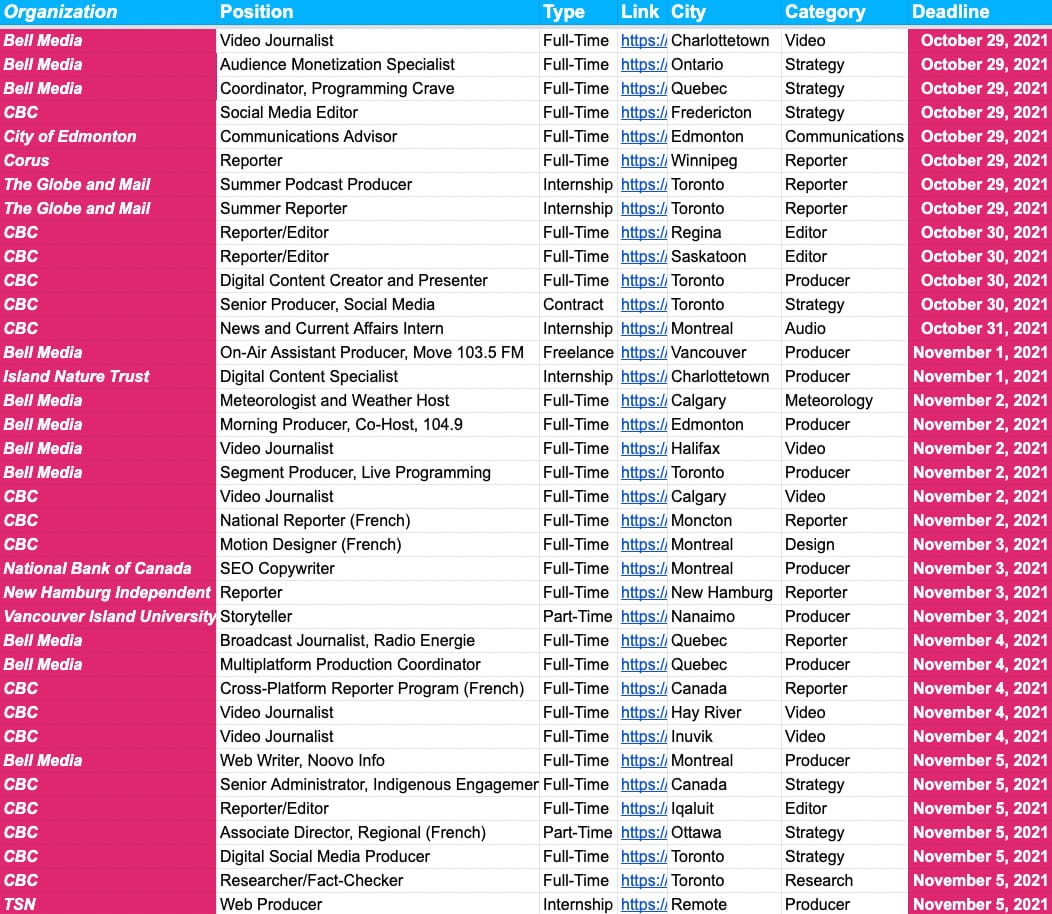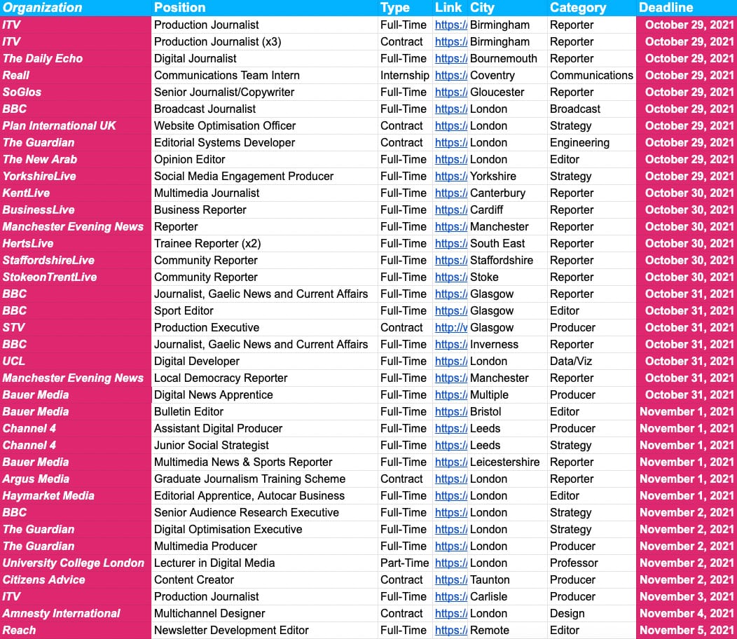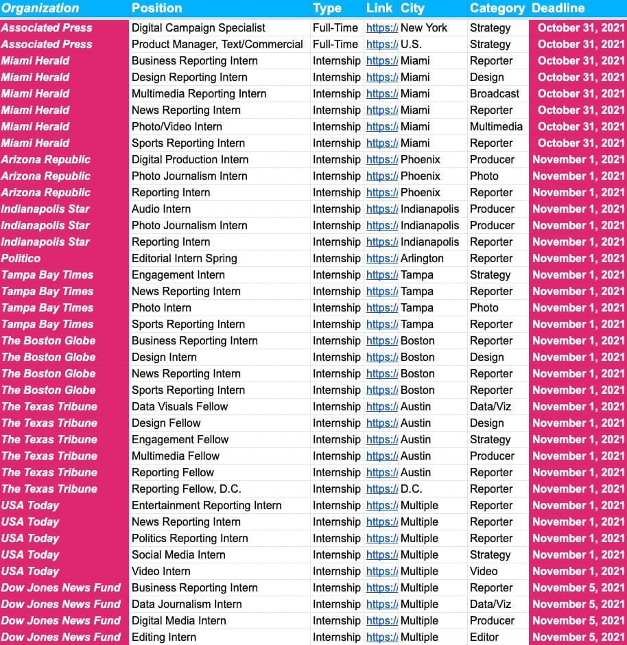 In the U.S., most of these deadlines are for various internship programs around the country. In the UK and Canada, there’s more of a mix of full-time jobs suitable for fresh graduates and early-career journalists.