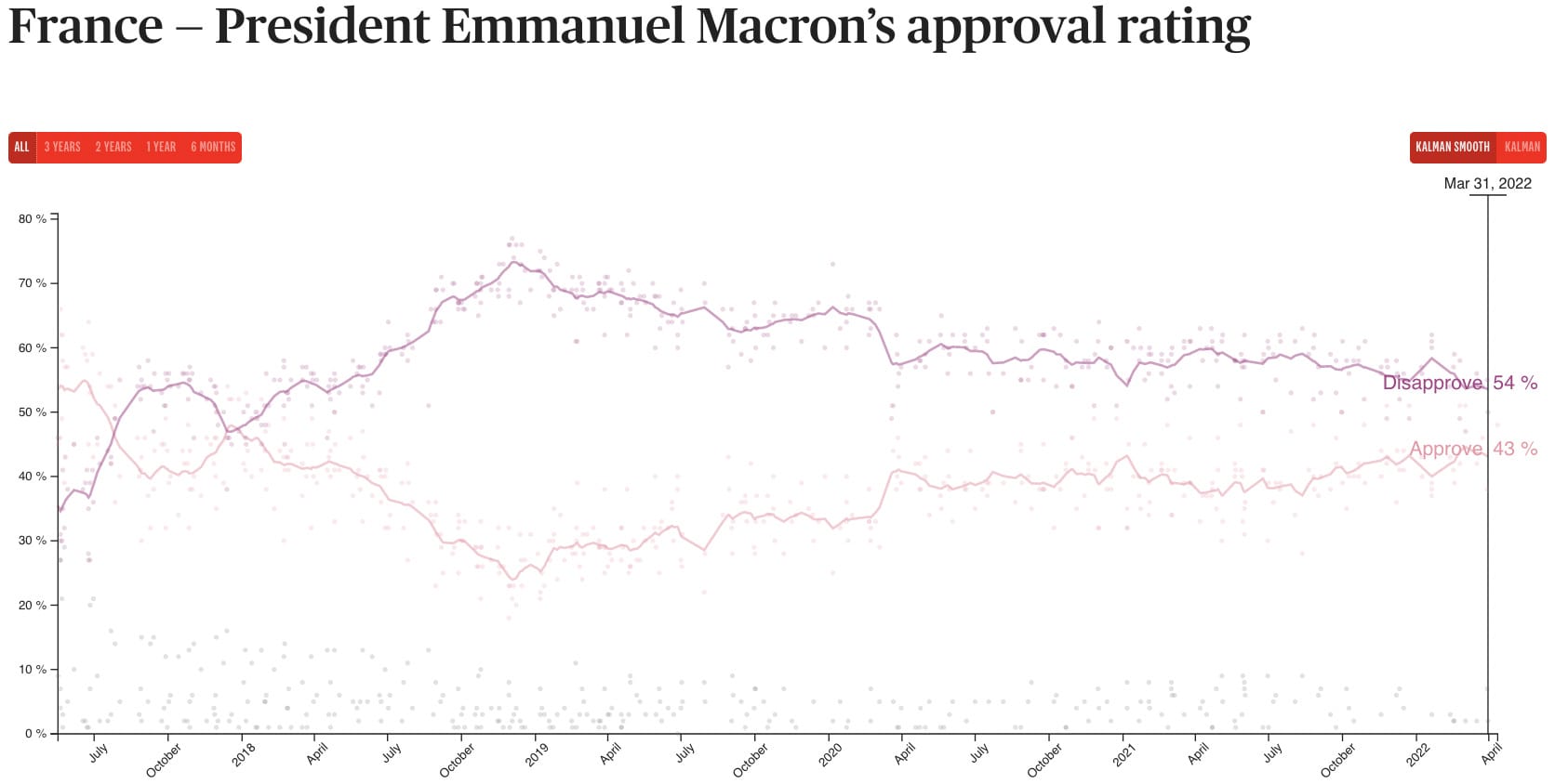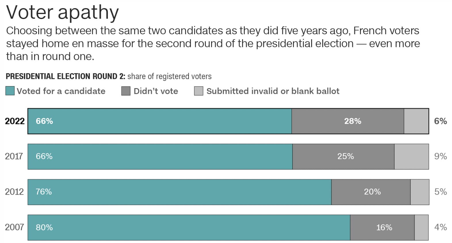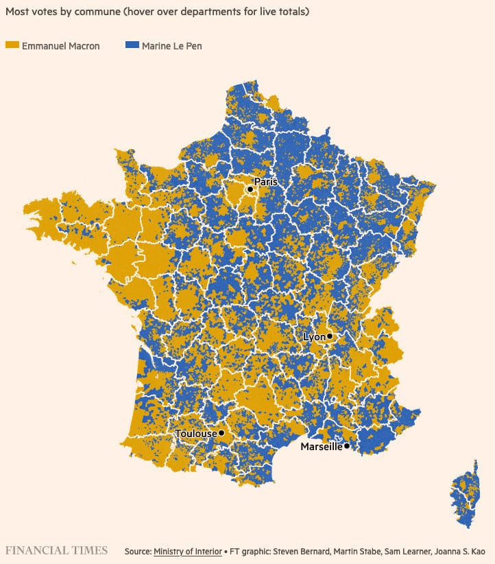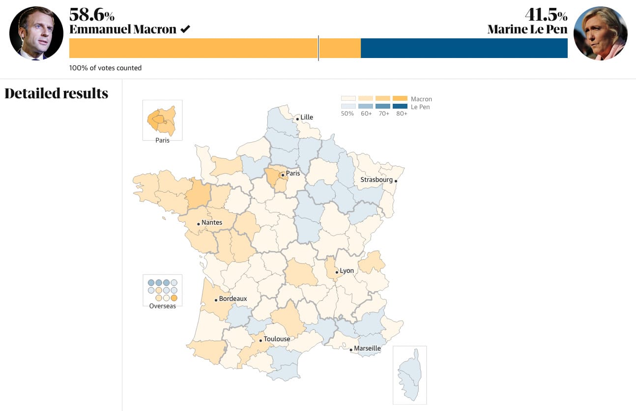 Someone who didn’t have a good weekend was Marine Le Pen, who was defeated by Emmanuel Macron in France’s presidential election for the second straight time. We haven’t done an Election Dissection in a while, so I’ve included some quick visuals explaining some of the key results and trends from the weekend.