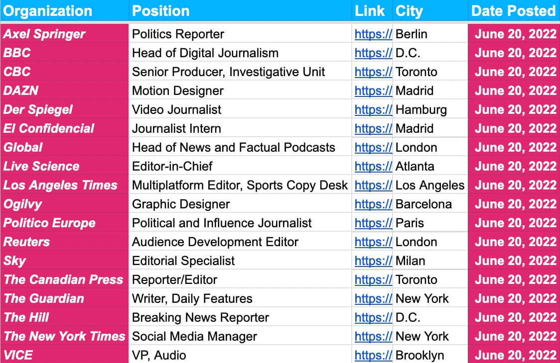On Friday we looked at highlights from another report — the 2022 Digital News Report from the Reuters Institute for the Study of Journalism. And there’s also hundreds of job deadlines for the likes of the BBC, Hearst, Human Rights Watch, European Journalism Center, Liverpool Echo, Amnesty International and Bell Media. Subscribe below for full access…