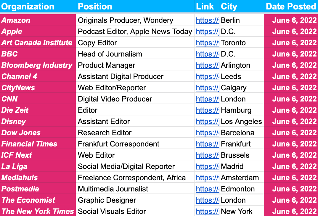 Be sure to check out Friday’s newsletter with hundreds of upcoming deadlines at the likes of the Associated Press, BBC, Bell Media, Canadian Press, Guardian, Human Rights Watch, Rest of World, The Times and WWF. And we also listed more than a dozen journalism conferences coming up this summer, with varying topics, locations and prices, so hopefully there’s at least one that catches your eye.