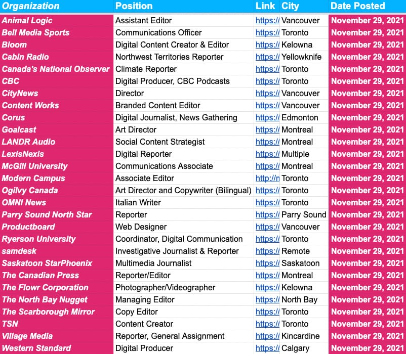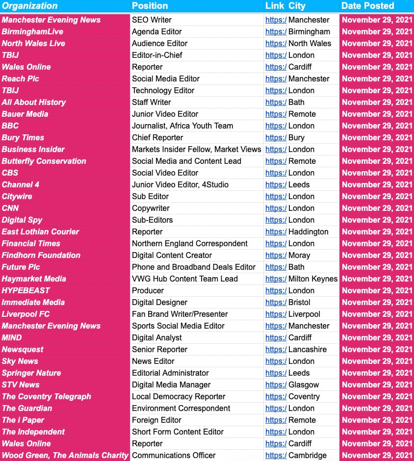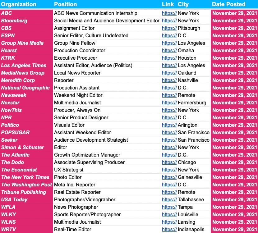 More than 2,500 jobs at more than 1,000 newsrooms across the U.S., UK and Canada. Below are screenshot previews of the jobs you’ll have access to when you subscribe. If you’re an editor with new openings, fill out this form and we’ll get those jobs added to the board ASAP!