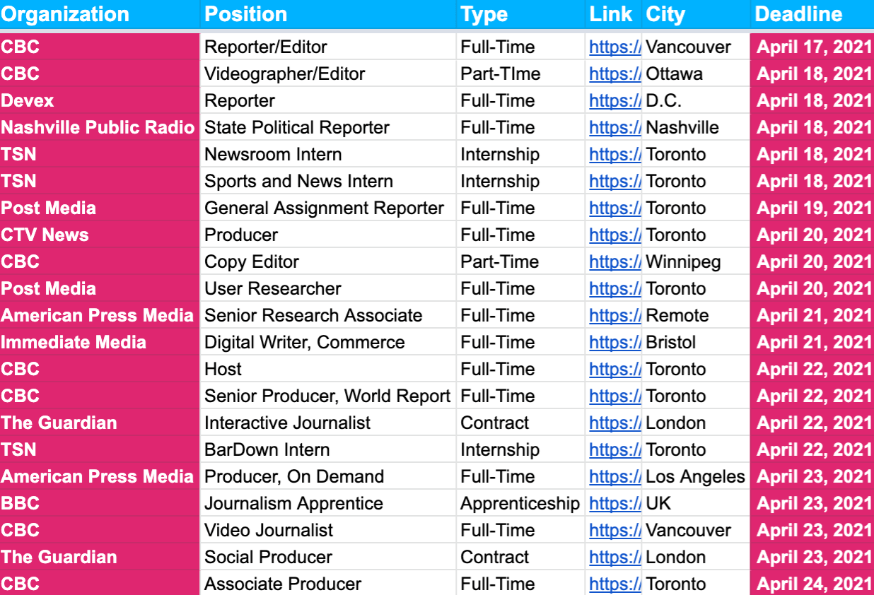 Another host of deadlines are approaching in the next week, including at the likes of American Press Media, CBC, Devex, Nashville Public Radio, The Guardian, CTV News, TSN and the BBC…👇