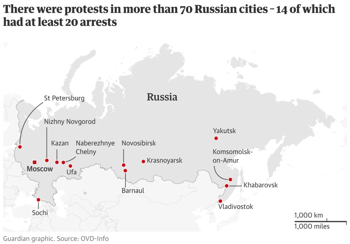 Moving to Russia next where tens of thousands are protesting across the country in support of Alexei Navalny, the face of opposition to President Vladimir Putin. Navalny returned to the country after several months in Germany where he recovered from being poisoned, which Putin essentially admitted to. The mass rallies, among the largest since 2012, resulted in violent confrontations with riot police, who beat protesters with truncheons and almost 4,000 were detained, including Navalny’s wife.