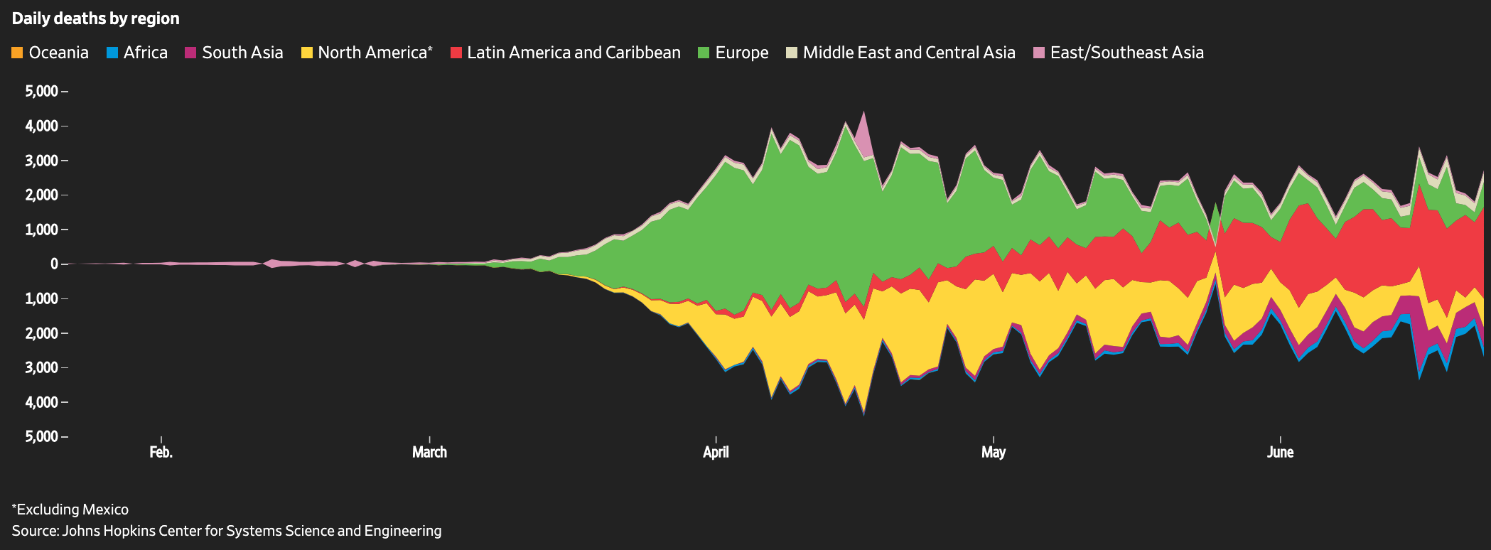 The past fortnight has seen the largest rise in global daily cases of any two-week period since the start of the pandemic in November. While the worst-hit regions include Latin America, the Caribbean and South Asia, second waves are popping up around the world. A number of reasons can explain the second spikes, but they’re most likely due to the mass protests over the past month and other general failed social distancing. Deaths will surge again as well, though that’ll take a few weeks due to the time lag between becoming ill and dying. I realize not everyone has a WSJ subscription, so I’ve included a couple of the charts we used below.