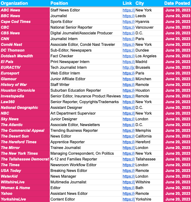 Check out the latest edition of our Journalism Awards, Events and Fellowships Deadlines Calendar. Some of my favourite new entries include Understanding the State of Podcasting in the U.S., ProPublica’s Summer 2023 Impact Report webinar, and The SPJ Freelance Fellowship.