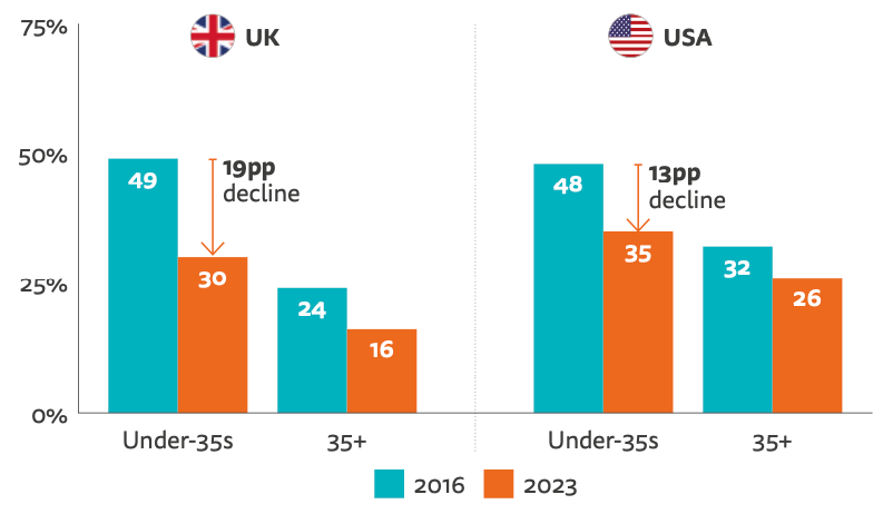 Interestingly, the U.S. and UK have some of the highest levels of distrust relative to the amount of criticism. According to the report, politicians are most often cited as the reason — 58% of the time in the U.S. — which also makes sense as we see the battle between the Democratic Party and Fox News, and the Republican Party and the ‘liberal media’ play out in front of us most days. In the UK, however, celebrities, comedians, and social media personalities are the primary source of exposure — 47% versus politicians at 41%.