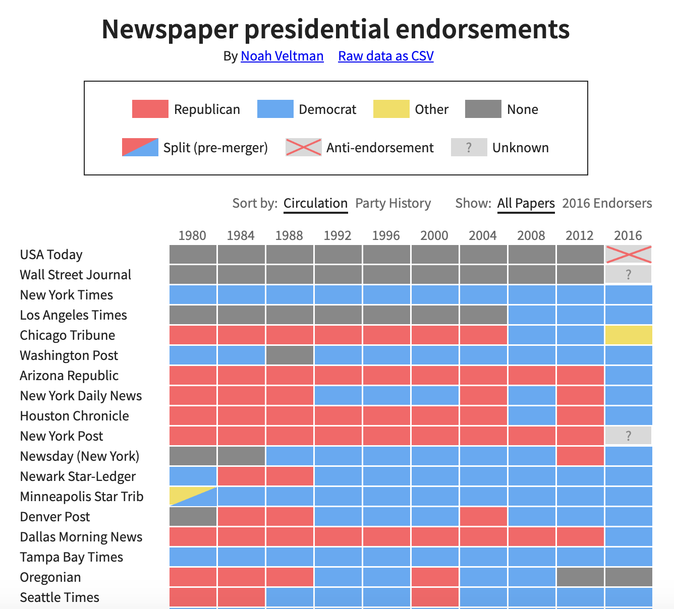 In any case, data viz whiz Noah Veltman neatly visualized every newspaper’s endorsement since 1980. Thank you Noah.