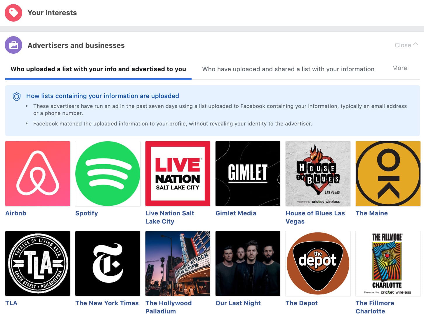 Now, seeing the likes of Airbnb or Spotify on the list won’t shock or surprise anyone. But I was weirded out as to why The Fillmore Charlotte, a music venue in Charlotte, North Carolina, had my details considering I’d never stepped foot in the state of North Carolina. This is an attempt by Facebook to showcase itself as transparent, but in reality it’s just a submission of the pressure stemming from a New York Times report that revealed Facebook’s emails to reveal their true mission.