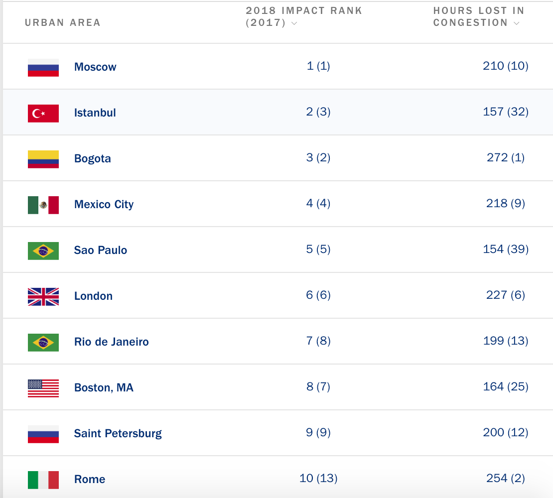 The number one issue for Andrew in his district is transportation, more specifically traffic and congestion. I’ve only ever taken the Amtrak into Boston, which is a story for another newsletter, but thankfully I didn’t have to experience the worst traffic of any major metropolitan area in the country. Though I did have to sell a kidney to be able to afford the ticket. Yes, Boston is worse than Los Angeles, which will make Bostonians even angrier, according to transportation data firm Inrix. In fact, Boston is eighth worst in the ENTIRE WORLD, where people lose about 164 hours a year on average from sitting in traffic. Probably not the best time to say that my walk to work takes me six minutes and 53 seconds (personal best).