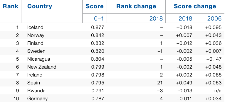Overall global gender parity is at 68.6 percent, up slightly from a year before. That figure is pulled up and down by different countries and subindexes, but overall, gender equality is improving.The subindex with the largest disparity is Political Empowerment — the number of women represented in parliaments around the world, followed by Economic Participation and Opportunity — the ability of women to enter the workplace. Educational Attainment and Health and Survival have 96.1 percent and 95.7 percent parity, respectively. The latter two are very positive.The number of women in parliament has improved dramatically in recent years, especially in countries such as Latvia, Spain and Thailand. But still only a quarter of the more than 35,000 global parliamentary seats are occupied by women. In some countries, women aren’t represented at all.The number of women in senior roles around the world has also increased. Globally, around 36 percent of senior private sector managers and public sector officials are women, a rise of about 2 percent from last year. This metric is also heavily weighted by a handful of countries.New problems exist lower down the ladder though. On average, only 55 percent of adult women are in the workforce, compared with 78 percent of men.Educational Attainment is another subindex weighted by developed countries in the west. Ten percent of women around the world are still illiterate. Significantly more investment is needed in developing countries.Progress is being made, but not fast enough. The overall global gender gap is slated to be closed in 100 years; Political Empowerment will take around 95 years to close; Economic Participation and Opportunity will take 257 years to close. BUT there is better news: Educational Attainment is on track to close over the next 12 years!Unsurprisingly, Western Europe has the highest gender parity of any region, followed by North America, Latin America and the Caribbean, Eastern Europe and Central Asia.At the current pace, overall gender gaps could be closed in 54 years in Western Europe, 59 years in Latin America and the Caribbean, 71 years in South Asia, and a whopping 151 years in North America.The five most improved countries in this year’s report are Ethiopia, Spain, Mali, Albania and Mexico.Iceland (God bless you) is once again the most gender-equal country for the 11th time in a row with a disparity of just 12 percent. In second is Norway, followed by Finland and Sweden. Notice anything?