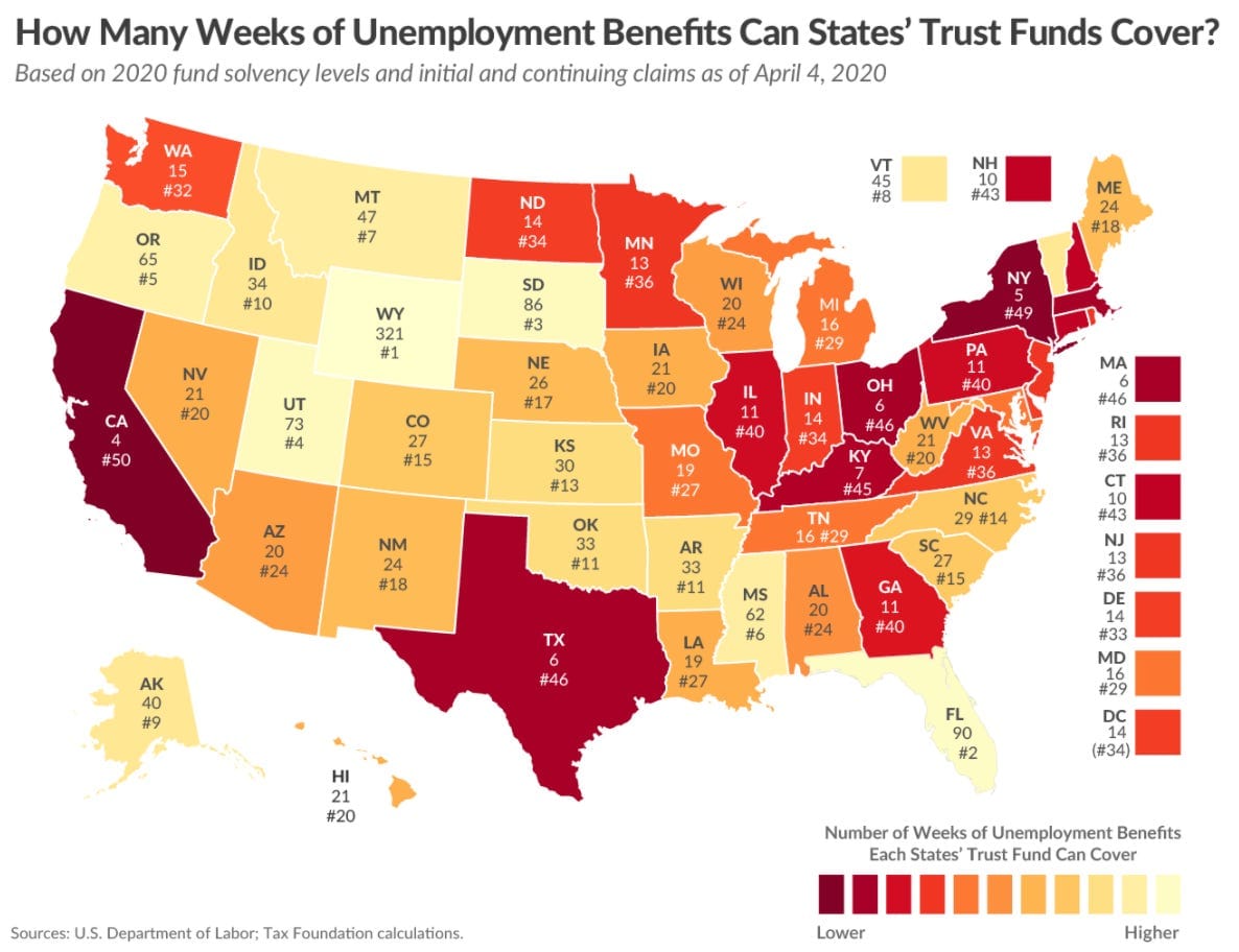 In Milwaukie, Mark and his team have done their best to offset the immediate and future financial losses his city’s workers and businesses will suffer due to the coronavirus. But Milwaukie just isn’t big enough to have the money saved in its coffers to deal with such a crisis. The same can be said of many states, who are beginning to struggle to foot the bill of unemployment claims due to the millions of layoffs and furloughs in recent months. A report by Tax Foundation shows that several states have enough money saved to survive several months, and Wyoming’s estimated to be able to cover its people for more than six years. Meanwhile the likes of California, Texas, Kentucky, Ohio, New York and Massachusetts can only afford to pay out unemployment benefits for up to seven weeks.