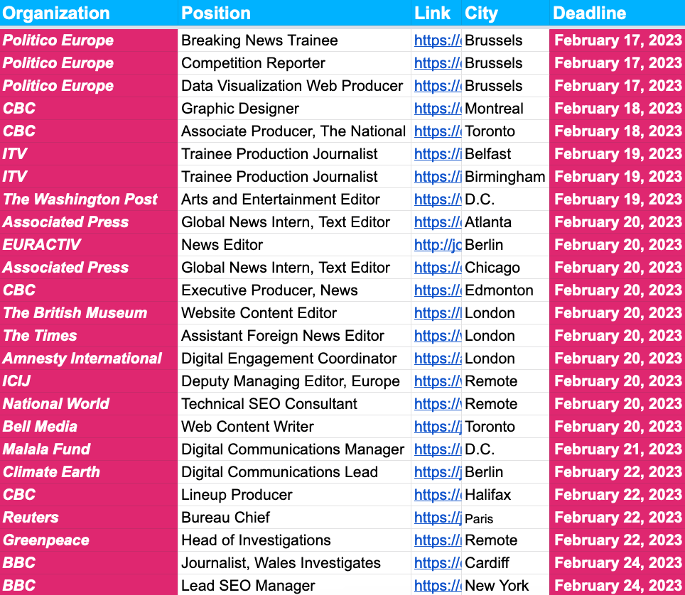 Happy Friday everybody! Welcome to the largest curated journalism jobs board in the world. If you didn’t already know, we aggregate more than 2,000 jobs from across the U.S., UK, Canada and Europe.