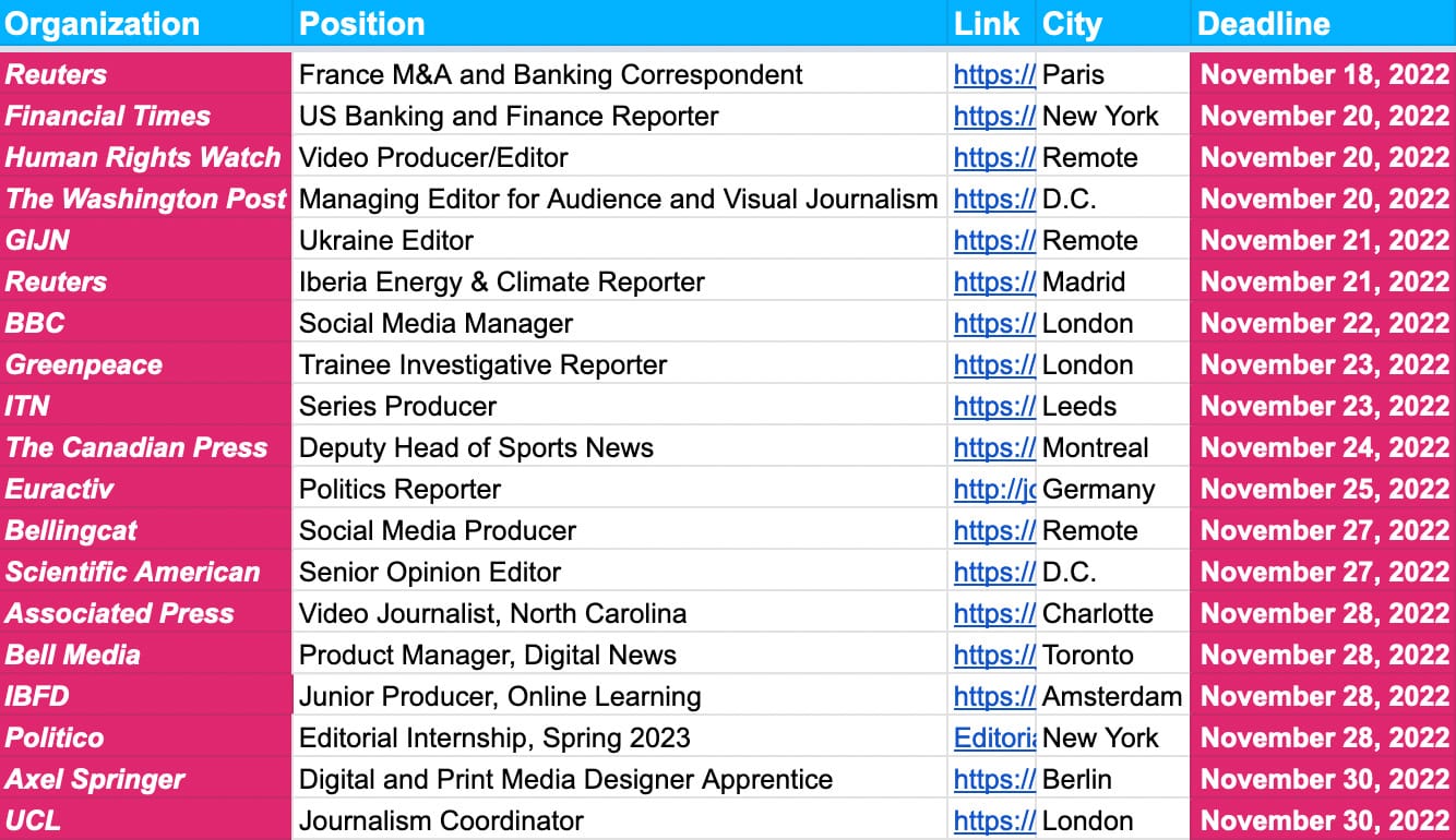 Before we do, check out last Monday’s jobs and news update where we looked into the recent bankruptcy of crypto exchange platform FTX, and what it means for journalism after a number of grants and donations from FTX founder Sam Bankman-Fried are now in question.