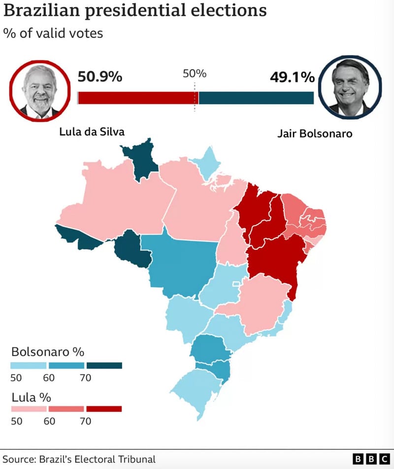 Okay, let’s do some news… The big election over the weekend took place in Brazil where Lula da Silva won the country’s presidential election with 50.9%, just 1.8% more than the incumbent Jair Bolsonaro. Da Silva returns to office after he was jailed in 2018 on corruption charges that were later annulled, but only after Bolsonaro won that year’s election. Poverty, housing and the Amazon will be among the priorities for Brazil’s new leader, but with such a tight margin, Bolsonaro could yet reject the results.