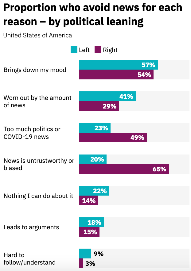 And lastly, let’s talk about “news avoiders”. According to RISJ’s 2022 Digital News Report, 38% of its survey respondents said they actively avoid the news. I’m split on this issue. As a journalist, it’s disheartening to see so many people disengaged with what’s happening around world, because of the negative impact it has on people’s moods and their feeling of helplessness. But when I put my non-journalist hat on, I sympathize and totally get it.