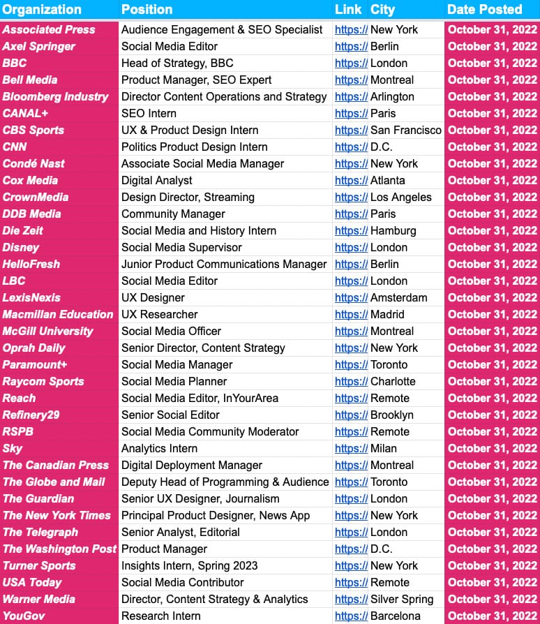 Before we get started, be sure to check out Friday’s newsletter with upcoming deadlines at the likes of CNN, Disney, Reuters, the FT, BBC, CBC, el Nuevo Herald, Bloomberg Industry, Globe and Mail, Politico, Euroactiv, Insider and the Boston Globe.