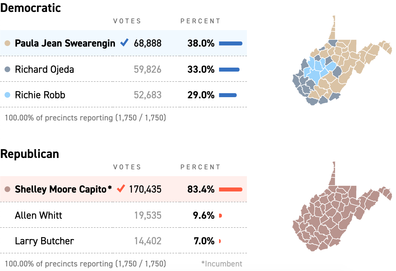 Friend of the podcast Paula Jean Swearengin won her Democratic primary for U.S. Senate from West Virginia this week, squeaking past Richard Ojeda and Richie Robb with 38 percent of the vote. From our conversation in February, Paula Jean is running on a platform that aims to address the chronic problems with coal and opioid addiction — the Mountain State has the worst drug overdose mortality rate of any state — and now she must work on uniting her party and steal the votes of Republicans on the fence in order to defeat incumbent senator Shelley Moore Capito, who’s voted Donal Trump 95 percent of the time.