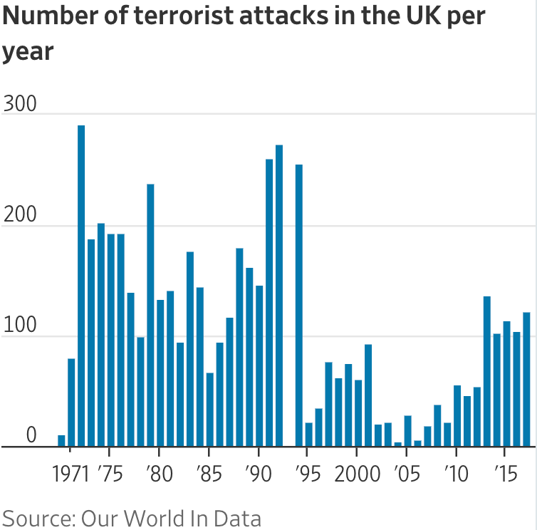 Moving north to the UK now as we remember the victims of the 7/7 bombings in London 15 years ago this week. Fifty two people were murdered and 700 injured when terrorists detonated four bombs across the city in the UKâs deadliest attack in recent memory. If there is any positive news, itâs that terrorist attacks in the UK are down significantly relative to the past half a century. During the 1970s, 80s and 90s the Irish Republican Army wrecked deadly havoc as they sought to end British rule in Northern Ireland and the reunification of Ireland. The worrying news is that the New IRA, established in 2012 by members from multiple terrorist groups, have waged a new deadly war. In 2017, the New IRA claimed responsibility for the murder of journalist Lyra McKee, who was shot dead while covering riots in Derry.