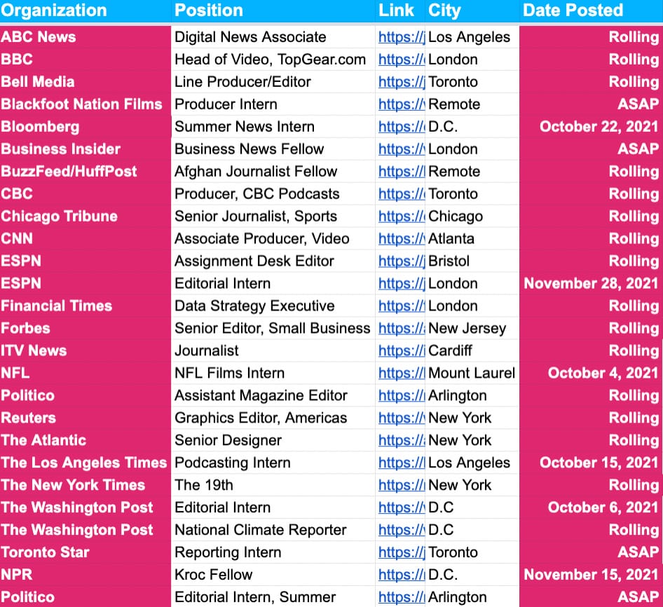 We have more than 2,500 jobs and more than 300 internships listed in 1,000+ cities across the U.S., UK and Canada. Below is a preview of the openings you’ll have access to when you subscribe. If you’re a paying member, your jobs sheet link remains the same each week.