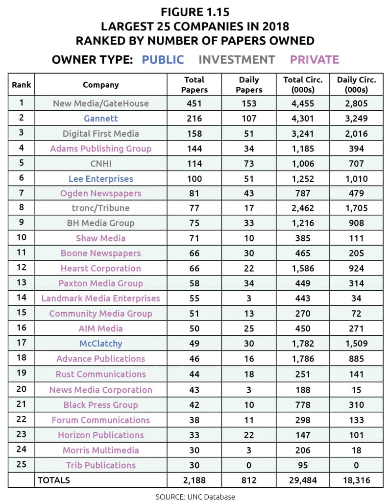 Large corporations have taken advantage of overall falling revenue in journalism, and have applied their ideology of cutting costs to boost profit. The Hussman School of Journalism and Media at the University of North Carolina at Chapel Hill found that the total number of newspaper owners has declined by 32 percent since 2004, or at an average of 100 newspaper companies per year. More than 2,000 newspaper titles are now owned by the largest 25 companies.