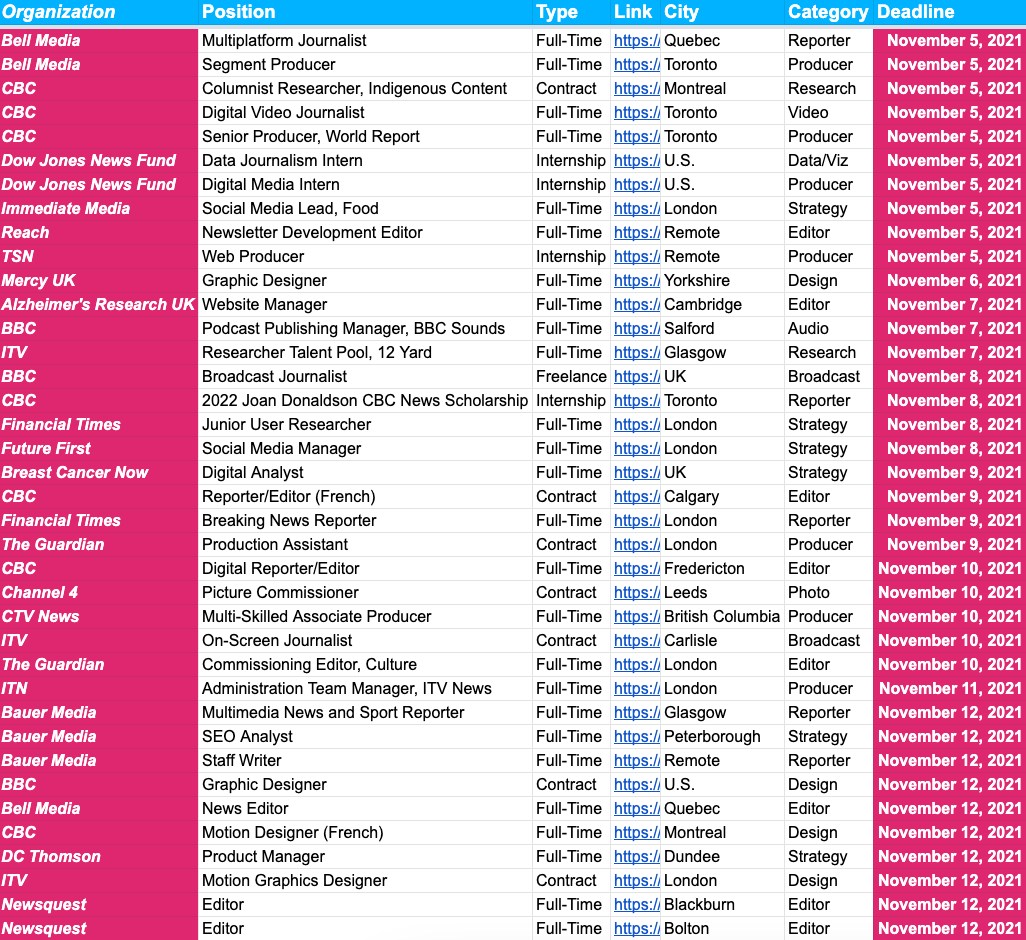 We currently have more than 2,500 jobs at more than 1,000 newsrooms across the U.S., UK and Canada. Below is a preview of some of the openings with deadlines approaching in the next seven days. Subscribe below for the rest and thousands more postings.